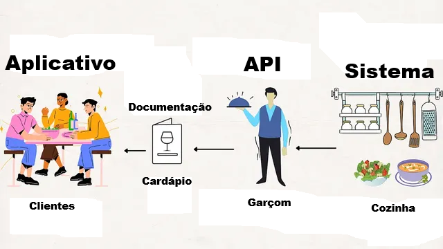 A API é o garçom: ela recebe o pedido, entende o que foi solicitado e repassa a informação para o sistema responsável. Em seguida, traz a resposta pronta, assim como o garçom entrega o prato finalizado.