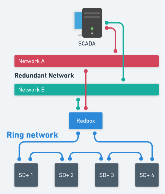Para possibilitar o uso de um ou mais SD+ em redes PRP é necessário o uso de um Redundancy Box, também conhecido como RedBox. O RedBox possibilita a inclusão de equipamentos com uma única interface de rede (equipamento SAN - Single Attached Node) em redes do tipo estrela redundante. De modo simplificado, o RedBox recebe o quadro do dispositivo SAN, duplica e encaminha-o para as duas LAN’s. O RedBox também recebe os quadros em redundância das duas LAN’s, sendo que o primeiro a ser recebido é encaminhado ao dispositivo SAN e o segundo é descartado.