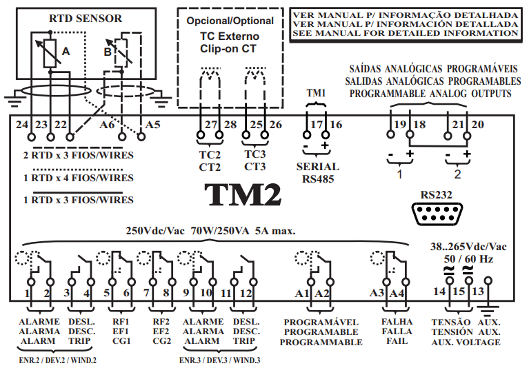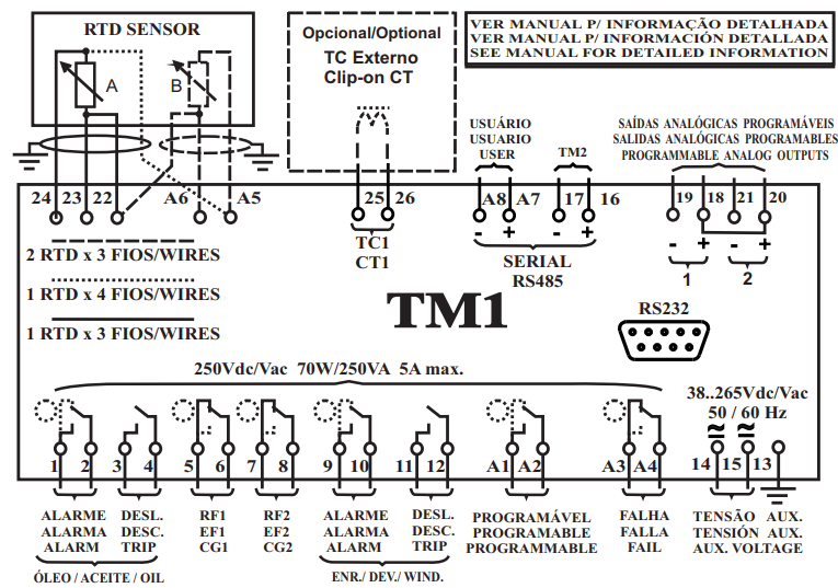 Destinado para o comando exclusivo dos grupos de refrigeração, o TM1 e o TM2 possuem dois relés Normalmente Fechados (NF) cada monitor de temperatura. Isso permite o comando de até 4 grupos de refrigeração forçada (utilizando TM1 e TM2). Ao energizar os Monitores de Temperatura, estes contatos mudam de estado, retornando à posição de repouso para ligar a refrigeração. Como mostrado na tabela a seguir: