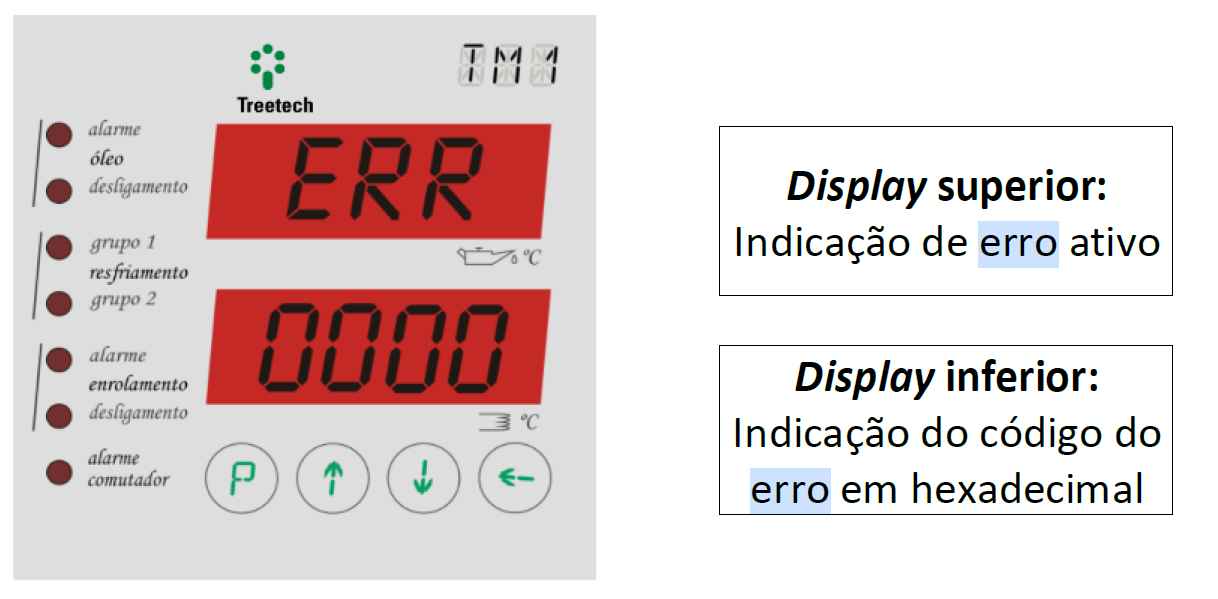 Ao detectar um problema, o TM indicará em seu display superior a sigla “ERR”, e em seu display inferior, o código do respectivo erro em hexadecimal, como ilustra a figura. Cada falha é representada por um dos seguintes valores: 1, 2, 4 e 8. O valor mostrado no dígito será a soma do valor de todos os alarmes ativos daquele dígito.